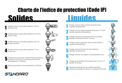 La charte de l’indice de protection (code IP), ou Indice de Protection international, se compose des lettres IP et de 2 chiffres. Telle que définie par la norme internationale CEI 6529, cette charte classifie le degré de protection d’un produit contre l’intrusion de deux types d’éléments dans les composantes électriques : les particules solides et les liquides.