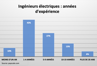 79% des ingénieurs électriques sondés possèdent moins de 10 années d’ancienneté. De ce nombre, la moitié (52%) ont moins de 4 années d’expérience.