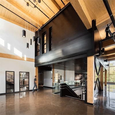 Passé le vestibule, l’étage principal du Centre d’Exploration s’ouvre directement sur le grand hall. Des poutres exposées en bois, un plafond suspendu en acier noir et des murs de vitre qui donnent sur la rivière s’inscrivent dans le thème « Urbaine de nature ».