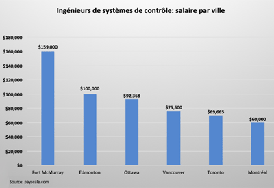 Ce graphique montre le salaire médian par ville pour les ingénieurs en systèmes de contrôle. Fort McMurray dépasse les autres villes avec un salaire médian supérieur de 86 000 $ à la moyenne nationale.