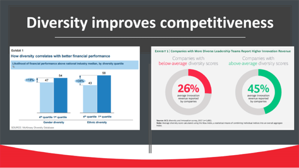 Le groupe Boston Consulting montre une amélioration de 73 % au niveau de l’innovation parmi les employeurs à la diversité supérieure à la moyenne si l’on compare aux employeurs affichant une diversité sous la moyenne.  L’innovation et la rentabilité sont très bien classées parmi nos membres et si nous voulons réussir, nous devons examiner sérieusement l’intégration de la diversité dans notre main-d’œuvre.