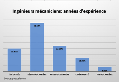 Le niveau d’expérience en pourcentage des ingénieurs mécaniciens montre que la majorité des ingénieurs mécaniciens se trouvent au début de leur carrière, ce qui augure bien pour l’avenir du secteur en ce qui concerne les tendances de l’emploi.