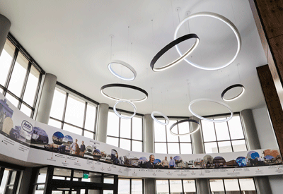 « Les luminaires Cycle donnent de la vie à l’espace et les employés de Dot Foods les voient comme un élément de design spécial dans leur nouveau hall », a dit Corbin. C’est agréable de voir ces luminaires fantaisistes devant les fenêtres immenses et la représentation graphique de l’historique de la compagnie autour du soffite. Le soir, on peut voir les luminaires de la rue par la fenêtre ».
