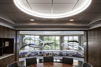 Le concept du design d’éclairage se prolonge à travers les autres aires de l’immeuble. Des appliques Cycle d’un diamètre de 72 po sont installées dans les salles de réunions des trois étages supérieurs qui surplombent le hall et elles sont visibles de l’étage du dessous. On retrouve également d’autres luminaires Cycle dans une aire de détente et dans une salle de réunion spéciale à l’étage principal.