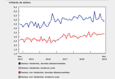 La valeur totale des permis de bâtir délivrés par les municipalités canadiennes a diminué de 2,4 % pour s’établir à 8,1 milliards de dollars en novembre. Au total, six provinces ont fait état de baisses, la plus marquée ayant été enregistrée en Ontario (en baisse de 5,7 % pour se fixer à 3,2 milliards de dollars). Cette baisse a été contrebalancée en partie par le Québec (en hausse de 10,3 % pour atteindre 1,9 milliard de dollars).