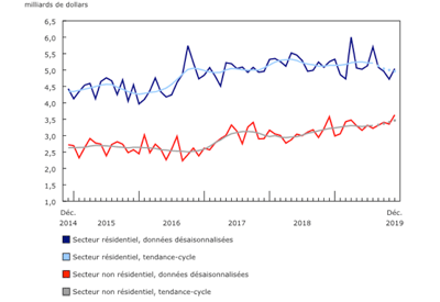 La valeur totale des permis de bâtir délivrés par les municipalités canadiennes a augmenté de 7,4 % pour s’élever à 8,7 milliards de dollars en décembre. Au total, cinq provinces ont fait état de hausses, les plus prononcées ayant été enregistrées en Ontario (en hausse de 10,5 % pour atteindre 3,4 milliards de dollars) et au Québec (en hausse de 15,8 % pour atteindre 2,2 milliards de dollars). Pour l’année 2019 dans son ensemble, les municipalités ont délivré des permis de bâtir pour une valeur de 102,4 milliards de dollars, en hausse de 2,6 % par rapport à 2018.