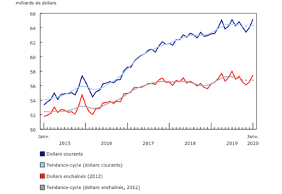 Les ventes en Ontario ont augmenté de 2,2 % pour atteindre 34,1 milliards de dollars en janvier, ce qui représente une troisième augmentation en quatre mois. Bien que des ventes plus élevées aient été enregistrées dans chaque sous-secteur, le sous-secteur des véhicules automobiles, et des pièces et accessoires pour véhicules automobiles, qui est le plus important de la province, a contribué le plus à la croissance, en hausse de 3,9 % pour s’établir à 8,0 milliards de dollars. L’augmentation dans le sous-secteur fait suite au ralentissement observé au quatrième trimestre de 2019, alors que les ventes avaient diminué de 1,9 % par rapport au trimestre précédent, en partie en raison des grèves dans la fabrication de véhicules automobiles, des répercussions du transport ferroviaire et des fermetures d’usines de fabrication de véhicules automobiles.
