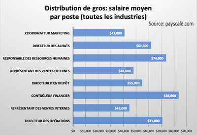 Le salaire moyen global pour la distribution en gros est de 57 000 $, parmi les personnes interrogées. Les postes non répertoriés comprennent le directeur du marketing (62 000 $), le directeur de succursale (62 000 $), le superviseur d’entrepôt (55 000 $) et le directeur des opérations (99 000 $).