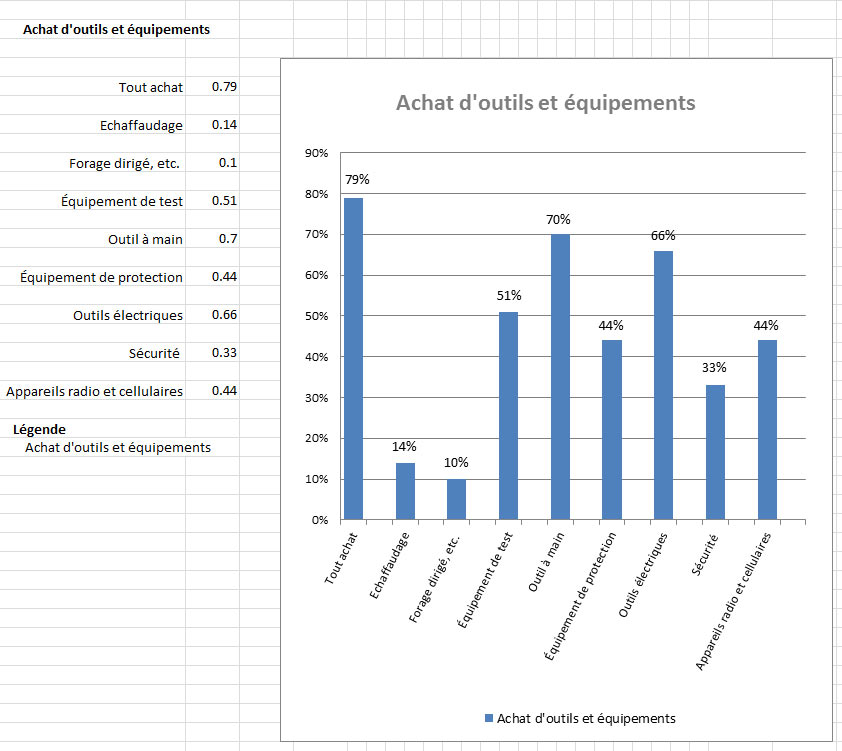 Lorsqu’ils sont consultés sur leurs intentions d’achat en 2014, 79 % des entrepreneurs disent qu’ils feront l’acquisition d’outils ou d’équipement électrique. Les outils à mains et les outils électriques sont les achats les plus fréquents suivis par les outils de tests. Un nombre accru des intentions d’achat touche l’équipement de sécurité.
