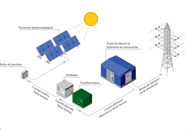 Le réseau collecteur aboutit au poste de départ de la centrale photovoltaïque. Celui-ci est l’interface de raccordement au réseau de transport ou de distribution, selon le cas.