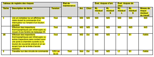 Comme nous l’avons déjà vu, des évaluations du risque de choc individuel et des risques liés à l’arc électrique sont réalisées pour chaque tâche distincte dans le cadre du processus global d’évaluation des risques. Pour ce qui concerne les tâches sous tension spécifiques, des paires applicables de tâche/danger sont définies, et l’évaluation individuelle de risque de décharge et/ou d’arc électrique est réalisée pour chaque paire de tâche/danger. Le niveau de risque résiduel le plus élevé parmi toutes les paires de tâche/danger associées à la réalisation d’un travail spécifique est le “niveau de risque global” de ce travail”. Un tableau du registre défini des risques et une matrice des évaluations des risques et dangers électriques (voir les figures 1 et 2 ci-dessous) peuvent être utilisés pour compléter et documenter le niveau de risque global.