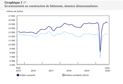 En dollars constants (2012=100), l’investissement en construction de bâtiments a diminué de 1,8 % pour s’établir à 12,4 milliards de dollars en septembre.