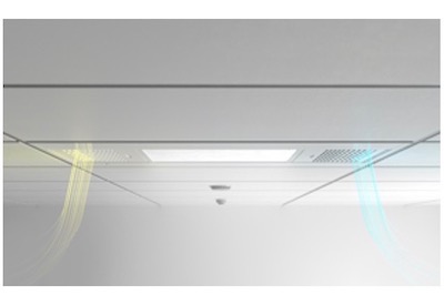 2. Un montage plafonnier permet d’aspirer les agents pathogènes vers le haut hors de la zone de respiration où la plupart de ces agents sont expulsés (car ce sont les humains qui sont à l’origine de particules infectieuses). Cette aspiration active vers le plafond assure l’ascension constante des particules infectieuses les évacuant en principe des espaces occupés. Le mouvement de l’air est ainsi moins gêné par l’emplacement des personnes et des meubles.
