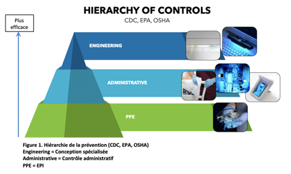 5. Ces dispositifs représentent une sécurité intégrée, classée par ailleurs parmi les plus performantes de celles-ci (voir Figure 1), car ils ne requièrent aucune intervention humaine (à l’exception de l’entretien annuel). En principe, on peut les installer et les oublier jusqu’au moment de l’entretien (habituellement une fois par an dans le cas d’une utilisation 24/7). Par contre, les dispositifs autonomes (mis en place sur le sol ou sur une table) fonctionnent aussi en permanence, mais sont – dans la plupart des cas – des systèmes de filtrage multicouches nécessitant un entretien considérable. Si cet entretien n’est pas assuré de manière régulière, l’efficacité du produit en souffre. Les dispositifs autonomes sont donc classés sous la rubrique de contrôles administratifs. Les robots UV-C et les brumiseurs sont également classés sous cette rubrique, car, pour permettre leur fonctionnement correct, ils requièrent un entretien programmé ainsi que des interventions humaines, et nécessitent ainsi une utilisation intensive de main d’œuvre. Quoique essentiel dans certains cas, l’EPI est désignée comme moyen peu efficace, car le respect des règles de leur mise en place ne peut pas être assuré (que ce soit en fonction d’une utilisation non conforme ou de leur absence totale).