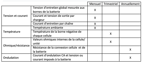 L’Institut des ingénieurs en électronique et en électricité (IEEE) est la principale source de pratiques standard pour l’entretien des batteries. Au cours de la durée de vie de la batterie, l’IEEE recommande d’effectuer une combinaison de tests sur une base périodique.