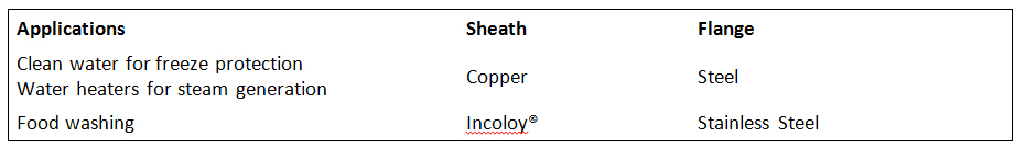 Pour les applications de chauffage de l’eau, l’utilisateur peut choisir parmi une vaste gamme de matériaux pour la bride et pour la gaine des éléments, de puissance nominale (kilowatts) et de grosseur de récipient.