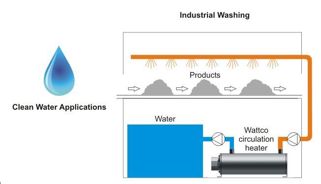 Les réchauffeurs à circulation (aussi appelés réchauffeurs en ligne) sont conçus pour le chauffage indirect. Une application importante des réchauffeurs à circulation est le chauffage de l’eau claire, par exemple, tel que requise pour le lavage industriel (Figure 1).