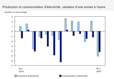 La consommation d’électricité a diminué pour un cinquième mois consécutif, en baisse de 4,2 % d’une année à l’autre pour s’établir à 49,4 millions de MWh en novembre. La baisse est principalement attribuable à la demande plus faible au Québec (-7,8 %), en Ontario (-4,0 %) et en Colombie-Britannique (-1,7 %), en raison de la diminution de la demande saisonnière de chauffage et de l’activité économique réduite.