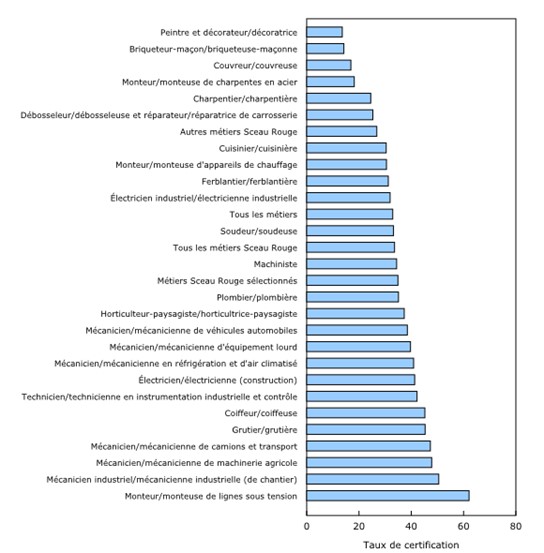 En 2019, soit six ans après s’être inscrits à leur programme, les apprentis qui affichaient les taux de certification les plus élevés étaient ceux des métiers désignés Sceau rouge, notamment monteur ou monteuse de lignes sous tension (62,1 %), mécanicien industriel ou mécanicienne industrielle (de chantier) (50,5 %), mécanicien ou mécanicienne de machinerie agricole (47,8 %) et mécanicien ou mécanicienne de camions et transport (47,3 %). Parallèlement, 10 métiers désignés Sceau rouge sur 25 affichaient des taux d’abandon supérieurs à 50 %; les taux les plus élevés ont été observés dans les métiers de monteur ou de monteuse de charpentes en acier (66,2 %), de peintre et de décorateur ou de décoratrice (62,1 %) ainsi que de débosseleur ou de débosseleuse et de réparateur ou de réparatrice de carrosseries d’automobiles (58,2 %).