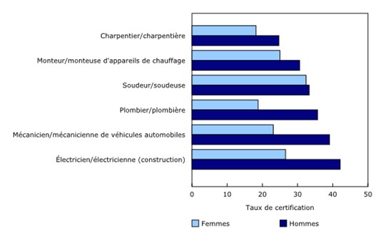 Dans les métiers où les nombres d’inscriptions d’hommes et de femmes sont comparables, l’écart dans les taux de certification entre les deux groupes était beaucoup plus faible. Par exemple, dans le métier de cuisinier ou de cuisinière, 30,0 % des femmes ont obtenu leur certification six ans après leur inscription, comparativement à 30,8 % des hommes.