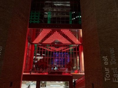 Un nouvel éclairage dramatique installé au plafond du Complexe Guy-Favreau accueille désormais les invités, les employés et les résidents de l’édifice de 12 étages installé dans le cœur du centre-ville de Montréal. Situé au 200, boulevard René Lévesque dans Ville-Marie à Montréal, le complexe immobilier est partagé entre le gouvernement fédéral canadien, qui a assuré la direction du projet, des entreprises privées, la Ville de Montréal et le Mouvement Desjardins. Le complexe multifonctionnel, qui a été construit en 1984 sur six acres de terrain, fait partie du réseau de la ville souterraine de Montréal et contient divers bureaux gouvernementaux canadiens, des immeubles locatifs, une coopérative d’habitation, des unités commerciales, une garderie et un petit parc en son centre.