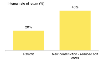 Les arguments économiques en faveur de l’ajout d’énergie solaire lors de la construction de nouveaux bâtiments sont particulièrement solides. En effet, ce que l’on appelle les « coûts accessoires », tels que les coûts de marketing et de vente, ainsi que les coûts de main-d’œuvre et de construction, peuvent être réduits, tandis que les avantages restent les mêmes. En Californie, les arguments économiques en faveur de l’ajout d’énergie solaire résidentielle sur les maisons existantes sont déjà bons à 20 % TRI, mais le nouveau rapport estime que ce chiffre est deux fois plus élevé, à 40 % TRI, lorsque l’énergie solaire est ajoutée au point de construction. En France, le TRI du solaire résidentiel pourrait être porté à 28 % lorsqu’il est ajouté lors d’une nouvelle construction.