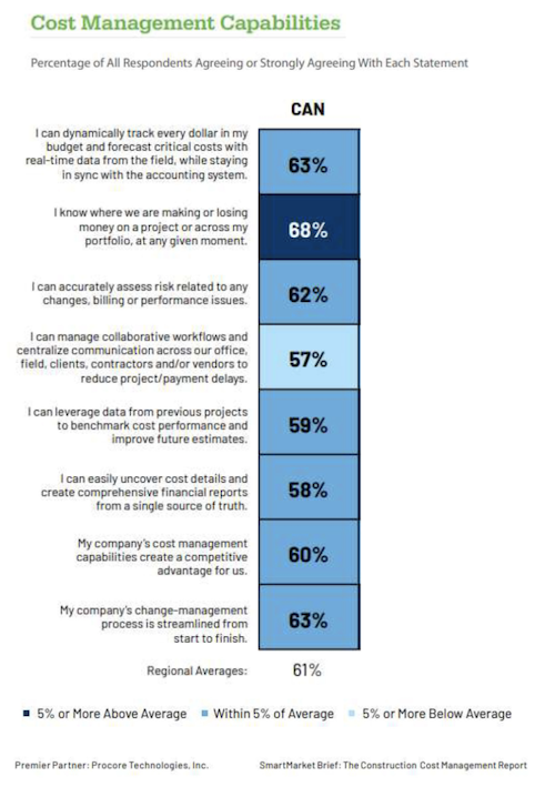 - Et, bien qu’un grand nombre de répondants canadiens aient indiqué qu’ils savent à tout moment où ils gagnent ou perdent de l’argent sur un projet ou dans l’ensemble de leur portefeuille, les résultats montrent qu’il y a de la place pour dépenser davantage pour la technologie dont ils ont besoin pour réussir. En effet, 20 % des entreprises canadiennes ont déclaré qu’elles dépensent « le montant qu’il faut » pour la technologie nécessaire aux pratiques de gestion des coûts et 30 % ont déclaré qu’elles dépensent un peu moins ou beaucoup moins qu’elles devraient.