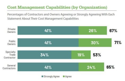 Le rapport montre que les maîtres d’ouvrage ont exprimé une plus grande confiance dans leurs capacités globales de gestion des coûts que les entrepreneurs interrogés, et chaque type de maître d’ouvrage étudié (public et privé) est plus confiant que l’un ou l’autre type d’entrepreneur (général et spécialisé). Les entrepreneurs généraux sont plus confiants que les entrepreneurs spécialisés.
