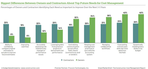 Les plus grandes différences entre les propriétaires et les entrepreneurs concernant les principaux besoins futurs en matière de gestion des coûts. (Graphic: Business Wire)