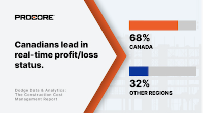 Rapport de Procore sur la gestion des coûts des nouvelles constructions : le Canada est en tête pour ce qui est de connaître en temps réel l’état des profits et des pertes de leurs projets ou portefeuilles avec 68 %. (Graphic: Business Wire)