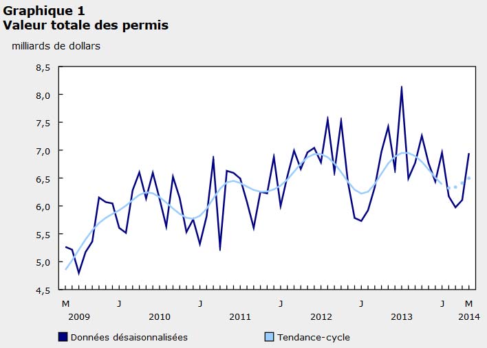 Les municipalités ont délivré pour 6,9 milliards de dollars de permis de bâtir en mai, en hausse de 13,8 % par rapport à avril. Cette augmentation a fait suite à une hausse de 2,2 % observée le mois précédent. La progression enregistrée en mai s’explique principalement par l’augmentation des intentions de construction d’immeubles à vocation commerciale en Ontario et au Manitoba, de même que de logements multifamiliaux en Colombie-Britannique. La valeur totale des permis a connu une légère tendance à la hausse depuis le début de 2014.