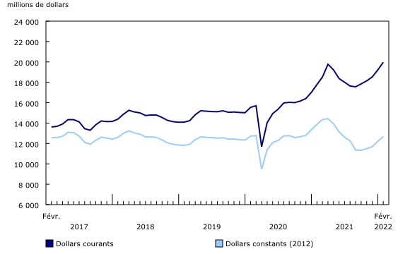 L’investissement en construction de bâtiments a progressé de 4,0 % en février et a atteint, pour la première fois, 20,0 milliards de dollars. La plupart des provinces ont fait état de hausses, et le Québec est à l’origine de plus de 50 % de la croissance.