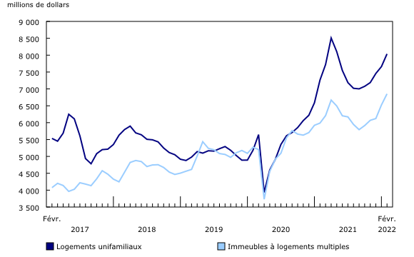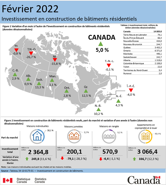Dans l’ensemble, l’investissement en construction résidentielle a augmenté de 5,0 % pour s’établir à 14,9 milliards de dollars en février.