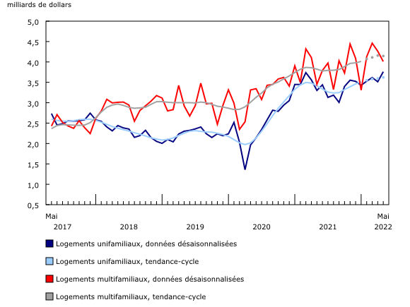 Les intentions de construction de logements multifamiliaux ont diminué de 5,9 % en mai, alors que les intentions de construction sont revenues à des niveaux plus habituels au Québec. En revanche, la Colombie-Britannique a enregistré une augmentation de 10,1 % en partie attribuable à un permis de construction d’un immeuble en copropriété d’une valeur de 112 millions de dollars à Surrey.