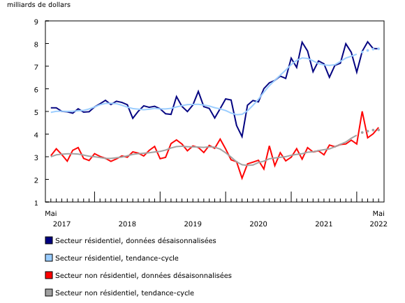 La valeur des permis de bâtir dans le secteur résidentiel a diminué légèrement (-0,1 %) pour se chiffrer à 7,8 milliards de dollars en mai. Les hausses enregistrées en Ontario et en Colombie-Britannique ont été contrebalancées par les baisses observées dans sept autres provinces.