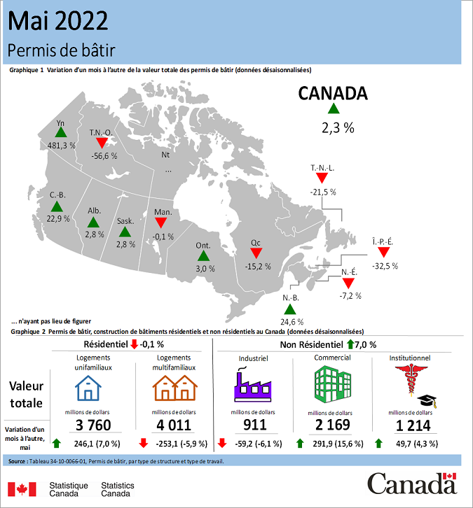 La valeur totale des permis de bâtir au Canada a progressé de 2,3 % en mai pour s’établir à 12,1 milliards de dollars. La valeur des permis dans le secteur non résidentiel a augmenté de 7,0 % pour atteindre 4,3 milliards de dollars, tandis que la valeur des permis dans le secteur résidentiel a diminué légèrement (-0,1 %) pour se chiffrer à 7,8 milliards de dollars.