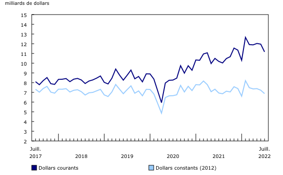 La valeur totale des permis de bâtir au Canada a diminué de 6,6 % en juillet pour se chiffrer à 11,2 milliards de dollars, principalement en raison du secteur résidentiel, qui a reculé de 8,6 % pour s’établir à 7,6 milliards de dollars. Le secteur non résidentiel a également diminué légèrement de 2,1 %.