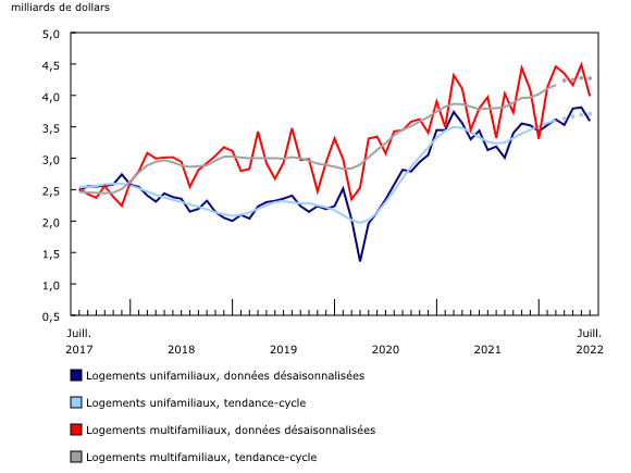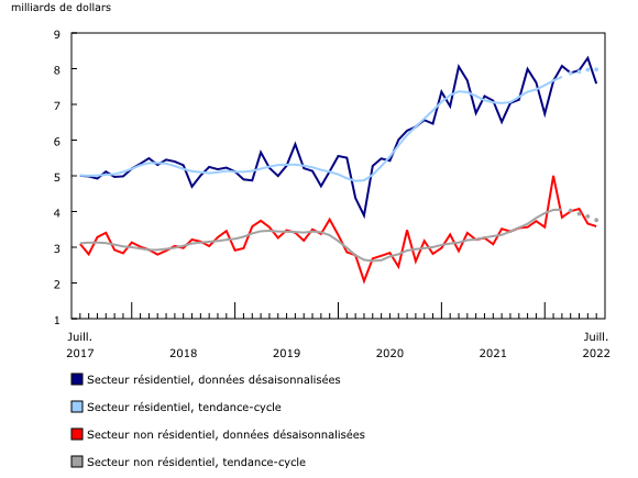 En juillet, la valeur des permis de bâtir du secteur résidentiel a diminué de 8,6 % pour se chiffrer à 7,6 milliards de dollars à l’échelle nationale. Les fortes augmentations observées en Colombie-Britannique et au Québec ont été contrebalancées par les faibles intentions de construction enregistrées dans six autres provinces.
