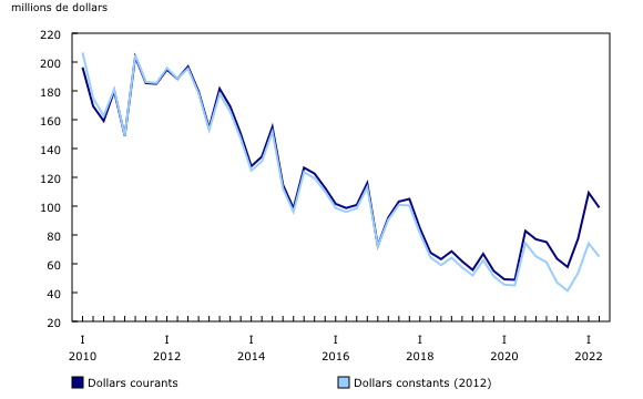 Depuis 2010, les permis non résidentiels pour la province ont également connu une tendance à la baisse. Sur une base annuelle, de 2010 à la fin de 2021, la valeur totale des permis pour le secteur à Terre-Neuve-et-Labrador a diminué de 59,0 %, tandis qu’au Canada, excluant la province de Terre-Neuve-et-Labrador, elle a augmenté de 38,0 %.