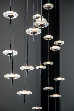 Une série de trois suspensions Drop Celeste sont installées aléatoirement à travers le plafond. Les suspensions présentent des configurations standards, toutefois, les designers ont eu l’option de spécifier la hauteur de chaque suspension pour l’adapter à l’espace, et ont ainsi réussi à créer un agencement unique qui évoque un lustre fait sur mesure. Chaque « câble » comporte une série de disques élégants en verre moulé artisanal. Les câbles traversent chaque luminaire Celeste en toute élégance, créant une continuité visuelle verticale.