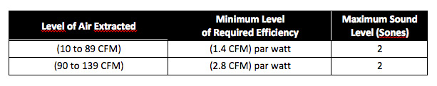5) Respecter les critères ‘’Energy Star’’ suivants; Débit d’air Niveau minimal d’efficacité Sones maximaux (10 à 89 PCM) (1,4 PCM) par watt 2 (90 à 139 PCM) (2,8 PCM) par watt 2 |