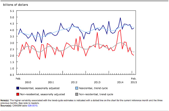 En février, la valeur des permis de construction résidentielle a augmenté de 1,5 % pour se chiffrer à 4,1 milliards de dollars, à la suite d’un recul de 8,1 % en janvier. Cette augmentation était attribuable à une hausse des intentions de construction dans six provinces, le Québec arrivant en tête, suivi de la Colombie-Britannique et de la Nouvelle-Écosse. L’Ontario a enregistré le recul le plus important dans le secteur résidentiel.