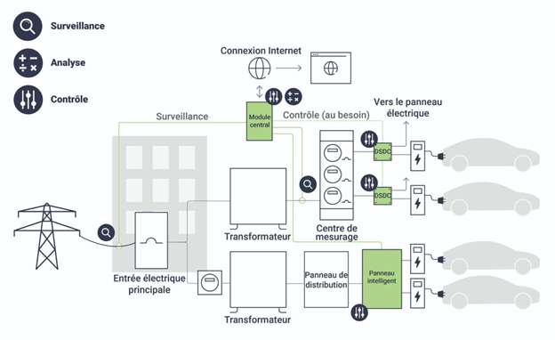 Un système de gestion de l’énergie des véhicules électriques surveille, analyse et contrôle la recharge des véhicules branchés.