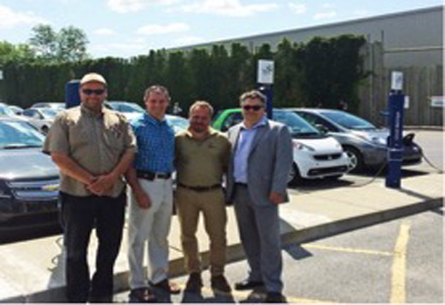 Sur la photo : Luc Vaillancourt, électricien, Stéphane Larrivée, directeur construction et entretien et Paul Gosselin, directeur général, Zoo de Granby ainsi que Renaud Cloutier, délégué, Électrification des transports à Hydro-Québec.