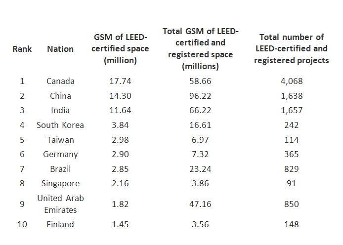 Le Canada conserve sa place au sommet pour la norme LEED pour la deuxième année consécutive.