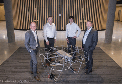De gauche à droite : Christian Bélanger, directeur Projets stratégiques et transversaux au Centre de recherche d’Hydro-Québec, Olivier Gualdoni, président-directeur général de DRONE VOLT, Martin Laporte, directeur général de DRONE VOLT Canada, et Jean Matte, directeur principal du Centre de recherche d’Hydro-Québec (IREQ). (Groupe CNW/Hydro-Québec)