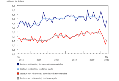 La valeur totale des permis délivrés dans le secteur résidentiel s’est accrue dans six provinces en mai, en hausse de 18,7 % pour se chiffrer à 4,8 milliards de dollars à l’échelle nationale. Le Québec a connu la progression la plus importante pour le mois, en hausse de 53,4 %. Le 20 avril, le Québec a permis la reprise des projets de construction résidentielle à livrer d’ici le 31 juillet et a autorisé les autres travaux de construction le 11 mai.