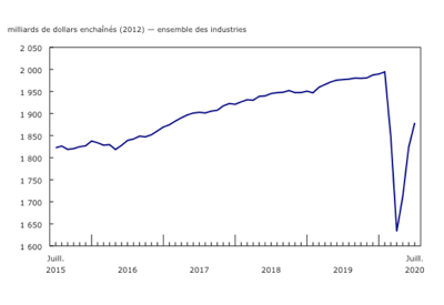 Le produit intérieur brut (PIB) réel a progressé de 3,0 % en juillet, après avoir augmenté de 6,5 % en juin. La troisième hausse mensuelle consécutive a continué de contrebalancer les baisses les plus fortes de l’activité économique canadienne qui sont survenues en mars et en avril; toutefois, l’activité économique globale est restée environ 6 % en deçà du niveau observé en février avant la pandémie.