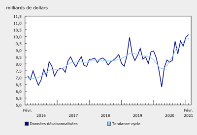 La valeur totale des permis de bâtir délivrés en février a dépassé la marque des 10 milliards de dollars pour la première fois, l’augmentation marquée enregistrée dans le secteur non résidentiel ayant plus que contrebalancé la baisse observée dans le secteur résidentiel.