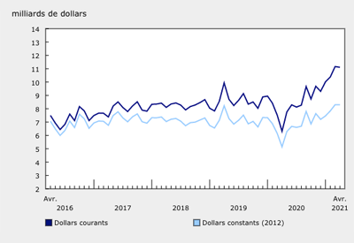 La valeur totale des permis de bâtir est demeurée à des niveaux historiquement élevés en avril 2021. Elle a affiché une légère baisse de 0,5 % pour s’établir à 11,1 milliards de dollars et elle a fait suite au sommet enregistré en mars. Ce léger recul était principalement attribuable aux baisses observées dans le secteur résidentiel en Colombie-Britannique et au Québec, qui ont plus que contrebalancé les hausses enregistrées à l’échelle nationale dans le secteur non résidentiel.